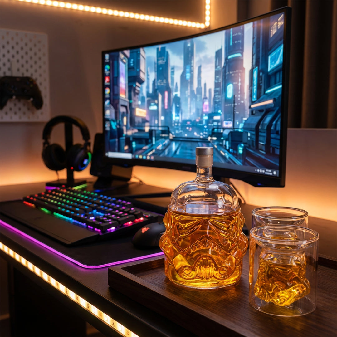 🎯 Stormtrooper Helmet Whiskey Decanter Set – 750ml Glass Bottle with 2 Double-Wall Glasses